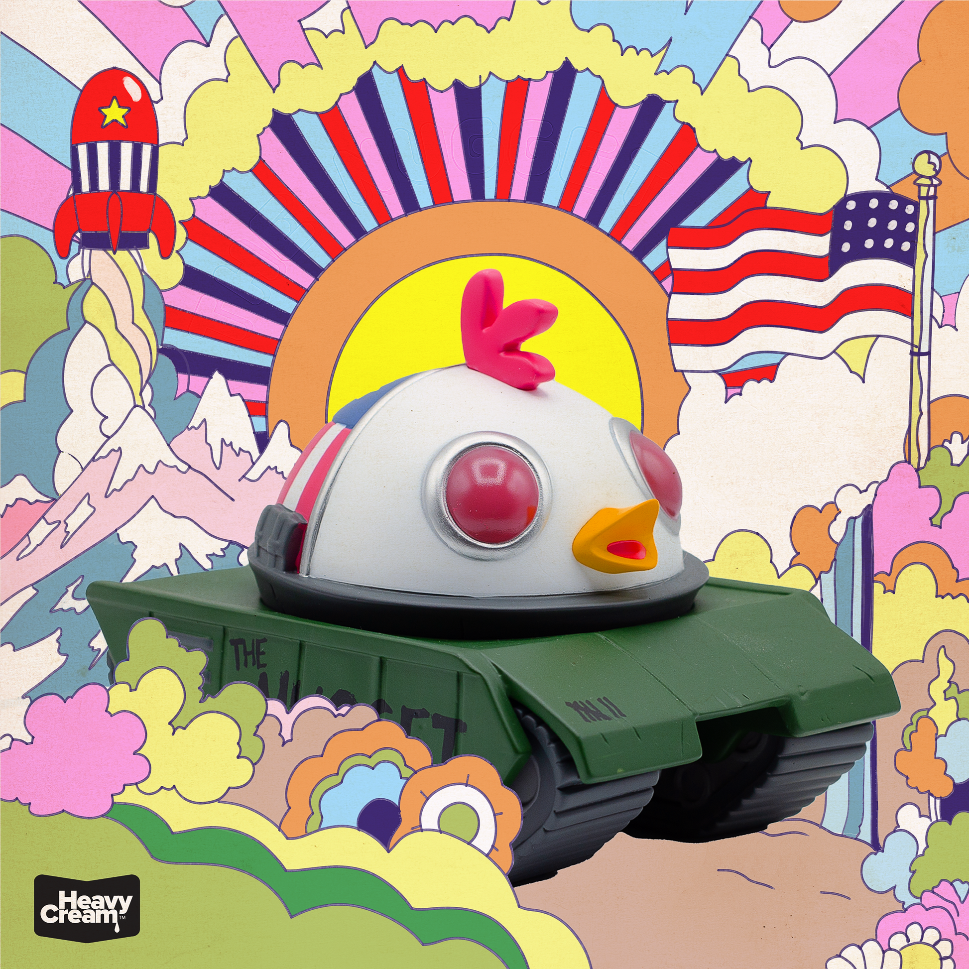 An extraordinary creation by Josh Divine, blending a menacing yet cute chicken + tank hybrid. This eye-catching designer toy captures the essence of contemporary art, making it a must-have for collectors and art enthusiasts alike.